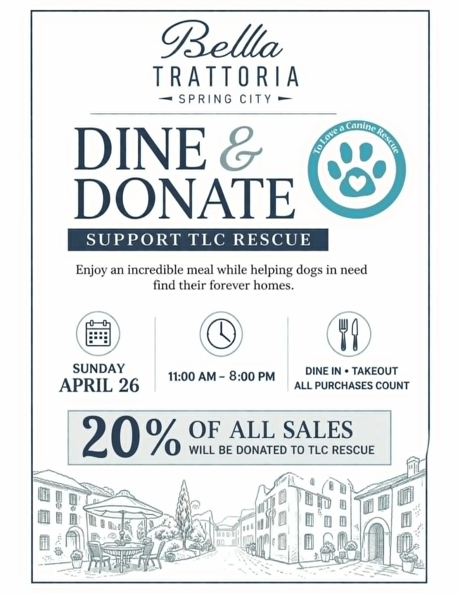 On Sunday, April 26 from 11:00 AM – 8:00 PM, head to Bella Trattoria in Spring City where 20% of everything you order will be donated to support the dogs of To Love a Canine Rescue.